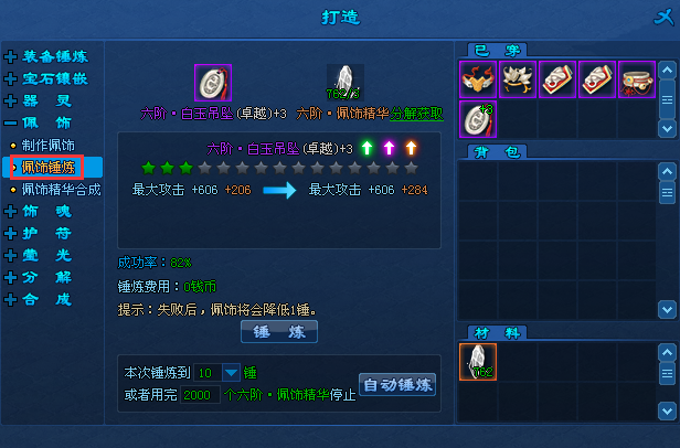 3、使用“锤炼”或“自动锤炼”,即可对佩饰进行锤炼;