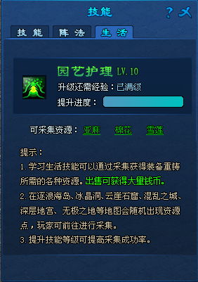 5、每个角色只能学习一种生活技能,若要更换生活技能,原先的技能等级和经验会清零;