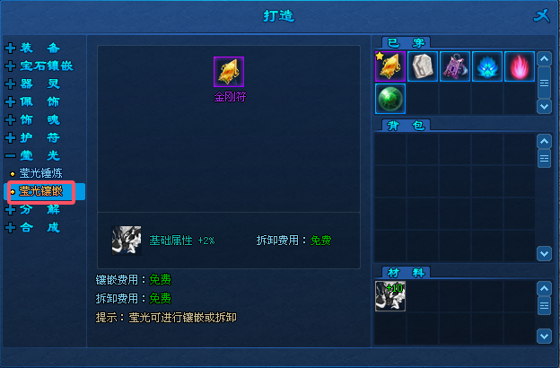3、左键点击材料框内的荧光,即镶嵌成功,若点击已经镶嵌在护符上的荧光,则为拆卸;