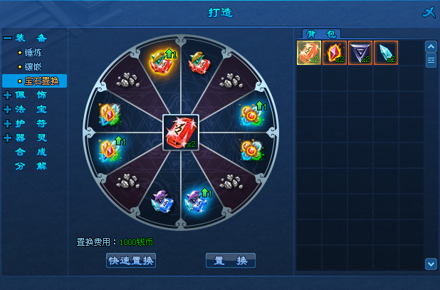 2、在界面中,将背包中的宝石,左键点击放在置换框内,点击“快速置换”或“置换”,即可;