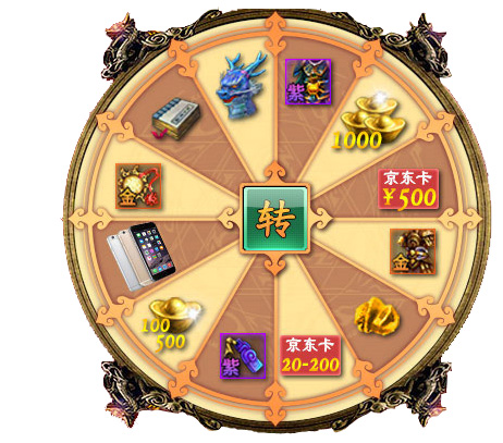 2、点击金豆可开启幸运转盘,有机会获得iphone6s,京东卡,极品坐骑,元宝等奖励;元宝通过游戏内邮件发放,京东卡将以卡密形式发放。