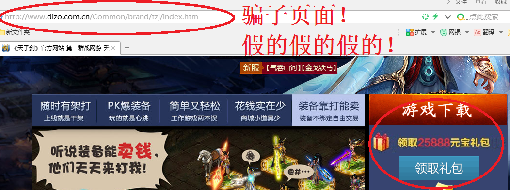 骗子使用聊天频道,在游戏中发送“您已经获得XX礼包”或“请登录***网站领取大奖”等类似的欺骗信息,欺骗玩家主动登录骗子事先建好的虚假官网或钓鱼盗号网站。(千万注意了:除了需输入帐号密码的页面是假的,其他页面的连接均连到正式官方网站)
