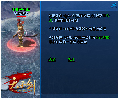 只要已经加入到势力,作为队长,你可以带队到中立地图的哨塔统领处,提交军令状,申请野地争夺战,申请成功后,在30分钟内摧毁哨塔就算占领成功。占领了领地的势力,要想方设法保住它;没能占领的势力,则要想方设法击把领地抢过来,一场争斗是在所难免的!