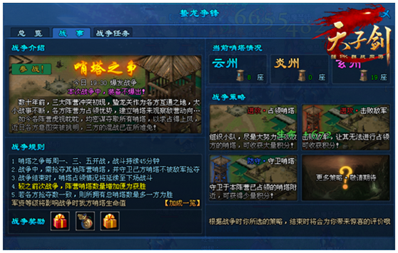 《天子剑》为群战而来!!!五大职业多元组合带来全新玩法、热血PK极致杀戮给你不一样的体验!“哨塔争夺战”作为游戏最激烈的玩法之一,让无数玩家为之疯狂,小编这里就来简单介绍一下,以备诸位大侠更好的带领兄弟尽情厮杀。