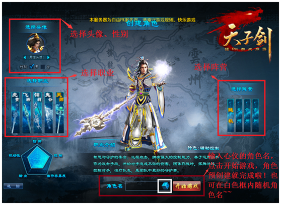 轻松三步,备战新服,先人一步,胜人一筹! 1、打开《天子剑》客户端,并登录已注册的账号; 2、选择自己喜欢的角色性别、头像、职业,阵营并取个最具特色的名字; 3、最后点击“开始游戏”,角色预创建成功!