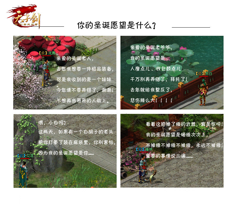 临近圣诞,街道上、商城中、店铺里的圣诞氛围是越来越浓厚啦。今晚是平安夜啦,吃个平安果,一起来感受生活里的每一份美好吧! 其实这明明是外国人的节日,咱们凑什么热闹呢,不过咱们还是凑下热闹吧! 你相信圣诞老人的存在吗? 若信,你会许什么样的圣诞愿望呢? 小编倒是希望真的有圣诞老人,那么我就要许个愿望:在《天子剑》中,锤炼永不掉,一路到锤神!!不知大家是否和我一样呢?你们的圣诞愿望是什么呢?在这里祝愿所有《天子剑》亲爱的朋友们:麦瑞克瑞斯么斯!