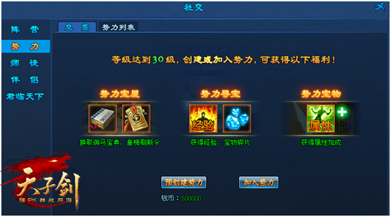 角色等级达到30级,即可创建或加入势力,打开社交界面(快捷键“Y”),点击“势力”可查看势力界面。《天子剑》创建势力的须知:需要流通钱币50W, 进行势力预创建后,组建军团击杀“巡山小将”方可激活势力;激活要求如下: