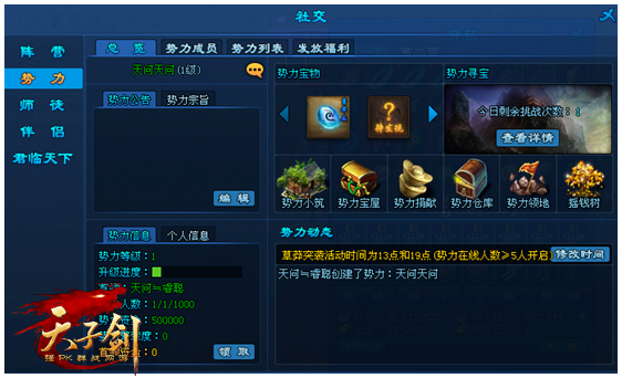 势力创建后,就可以查看势力的基本信息,包括势力个人信息、势力动态、势力各种活动等等,在势力面板上一目了然!在这里介绍下势力的各种活动吧。