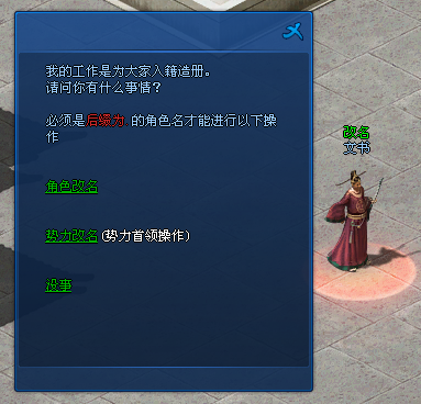 1、被添加后缀的玩家/势力首领可以到各国王宫门口(106.178)“文书”处进行改名操作(注:在修改时,均只有一次改名的机会,请慎重填写自己的新名字。)