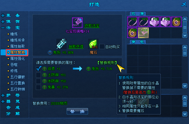 3、法宝属性替换有部位需求。例:法宝印中抽取的属性只能用于替换法宝印的属性;