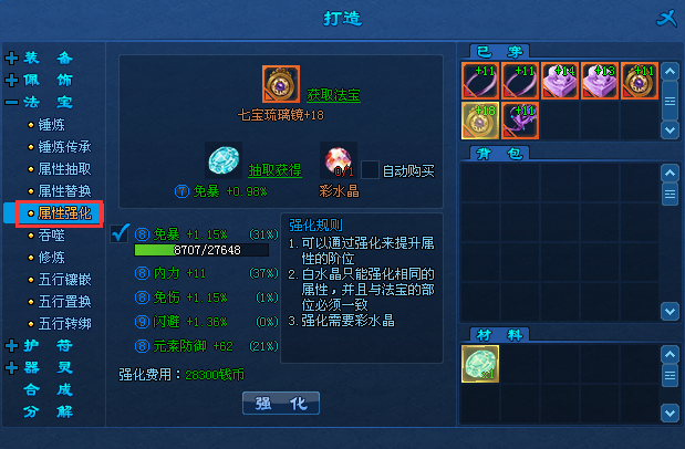 2、并且只能强化法宝中相同的属性;(例:攻击属性只能强化法宝中的攻击属性)
