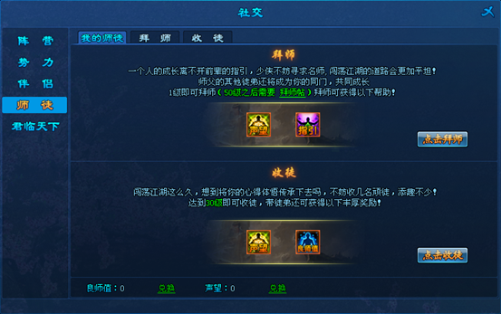 收徒:当角色≥30级,可收徒,每位玩家最多收6个徒弟;