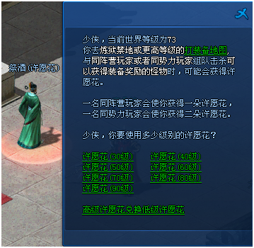 二、使用许愿花到NPC祭酒(各主城98.191),可兑换物品奖励。